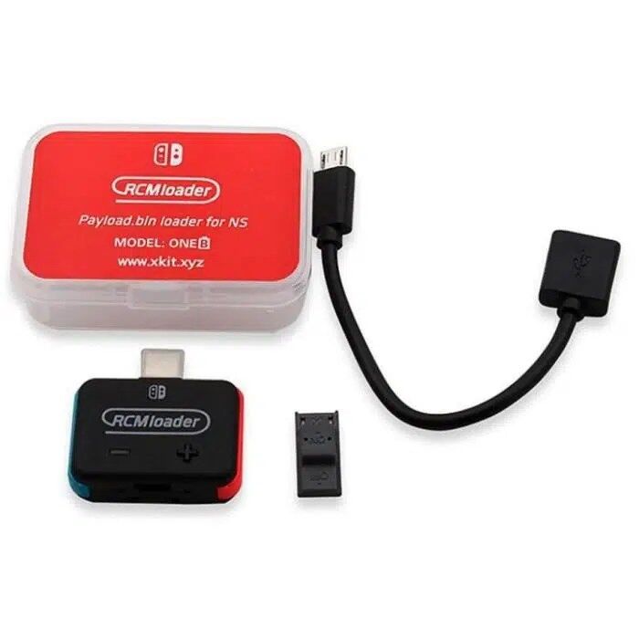 Dongle Rcm Loader pour console Nintendo Switch livré avec un câble et un jig.